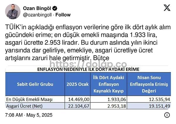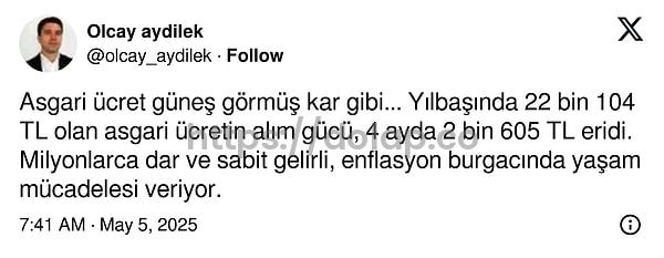 ‘Asgari fiyat güneş görmüş kar üzere… Yılbaşında 22 bin 104 TL olan taban fiyatın alım gücü, 4 ayda 2 bin 605 TL eridi. Milyonlarca dar ve sabit gelirli, enflasyon burgacında hayat uğraşı veriyor.