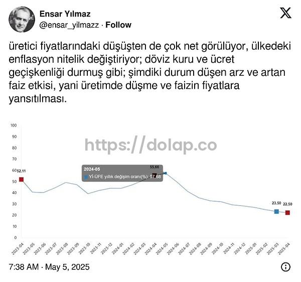 ‘Üretici fiyatlarındaki düşüşten de çok net görülüyor, ülkedeki enflasyon nitelik değiştiriyor; döviz kuru ve fiyat geçişkenliği durmuş üzere; şimdiki durum düşen arz ve artan faiz tesiri, yani üretimde düşme ve faizin fiyatlara yansıtılması.’