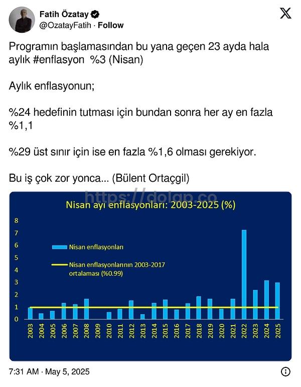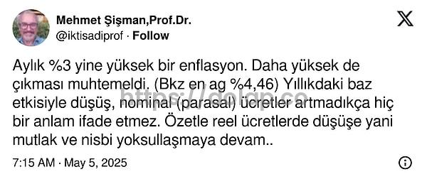 ‘Aylık yüzde 3 tekrar yüksek bir enflasyon. Daha yüksek de çıkması olasıydı. (Bkz. ENAG yüzde 4,46) Yıllıktaki baz tesiriyle düşüş, nominal (parasal) fiyatlar artmadıkça hiç bir mana tabir etmez. Özetle gerçek fiyatlarda düşüşe yani mutlak ve nisbi fakirleşmeye devam…’