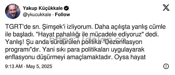 ‘TGRT’de sn. Şimşek’i izliyorum. Daha açılışta yanlış cümle ile başladı. ‘Hayat pahalılığı ile uğraş ediyoruz’ dedi. Yanlış! Şu anda sürdürülen siyaset ‘Dezenflasyon programı’dır. Yani sıkı para siyasetleri uygulayarak enflasyonu düşürmeyi amaçlamaktadır. Meğer hayat pahalılığı ile gayret ‘gelirler politikası’ ile olur…