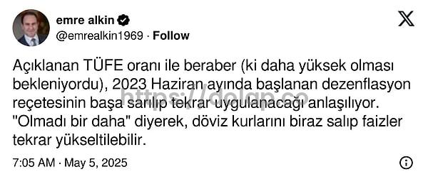‘Açıklanan TÜFE oranı ile bir arada (ki daha yüksek olması bekleniyordu), 2023 Haziran ayında başlanan dezenflasyon reçetesinin başa sarılıp tekrar uygulanacağı anlaşılıyor. ‘Olmadı bir daha’ diyerek, döviz kurlarını biraz salıp faizler tekrar yükseltilebilir.’